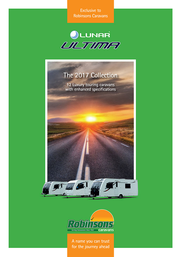 Robinsons Caravans have been supplying mobile holiday homes to satisfied customers since 1963 from sites in Derbyshire and Nottinghamshire. Wood Creative were asked in 2013 to manage the company’s advertising and marketing, to include re-designing the business’s sales literature, signage and point of sale material. The 2017 Ultima range of touring caravans, exclusively built for Robinsons’ by Lunar Caravans, is now in it’s 16th year of production.